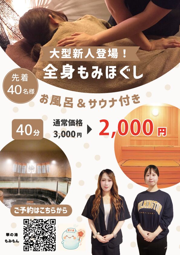 全身もみほぐし40分3,000円▶︎2,000円! お風呂&サウナ付き